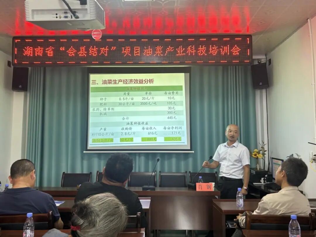 9月23日,油菜产业专项培训率先在万坪镇落地。湖南省作物学会肖钢副教授围绕油菜的生产概况、生产重要性、经济效益分析以及高效的种植技术四个方面进行了讲解,针对油菜菌核病、蚜虫等常见病虫害,传授了“农业防治+化学防治”组合方案,并发放防治手册;接着,国内著名油菜专家刘忠松教授接受了参训农户的问题咨询,有针对性地解决了群众疑问;培训结束后,省作物学会秘书长陈烈臣为参训农户逐一发放优质油菜种子,实现了科技服务“良技+良种”双重保障。